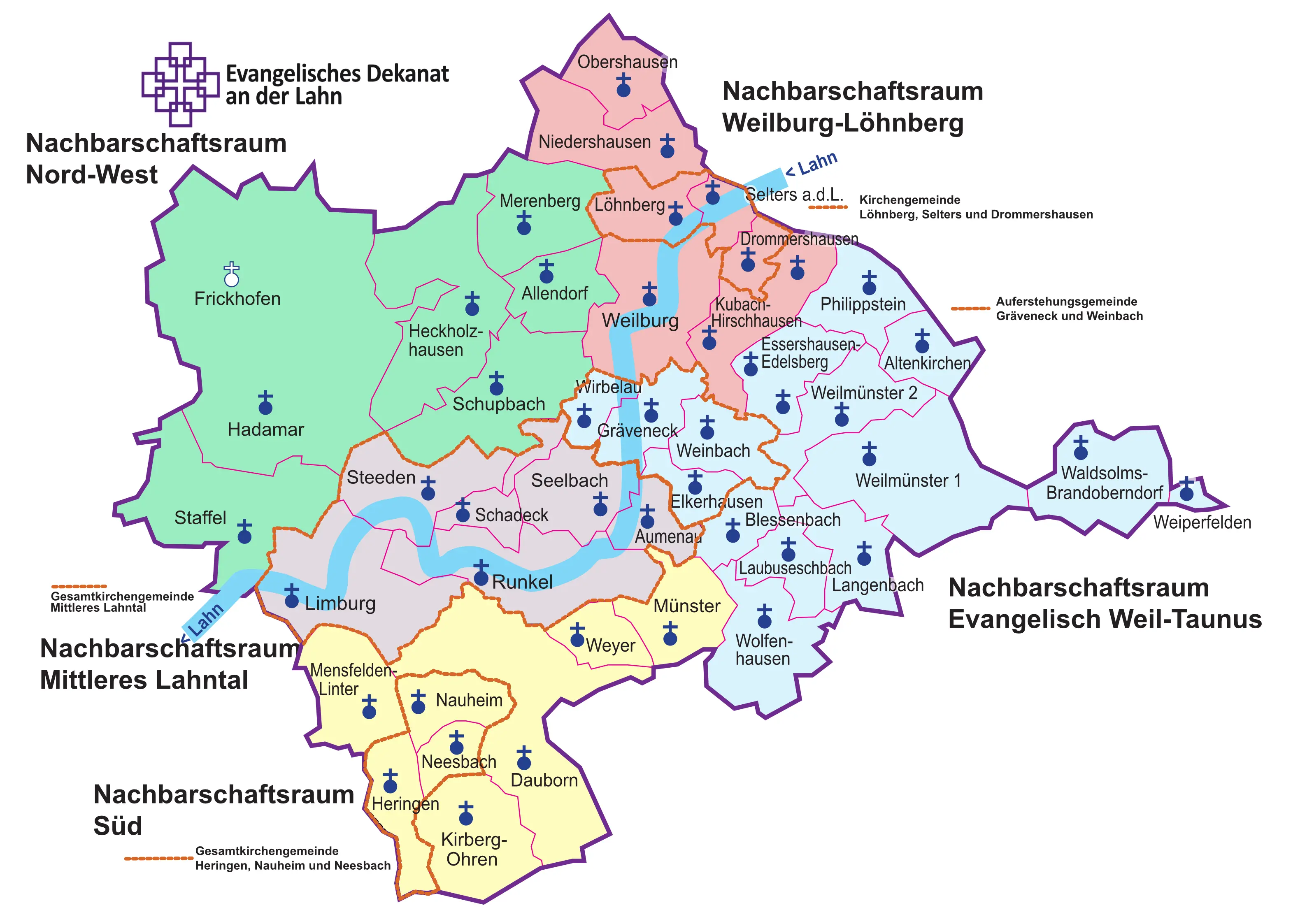 Seit 1.1.2022 sind die ehemaligen Dekanate Runkel und Weilburg fusioniert und bilden nun das Evangelische Dekanat an der Lahn. Die Gemeinden bilden fünf Nachbarschaftsräume. Mehr Informationen rund um die Nachbarschaftsräume finden Sie hier.
